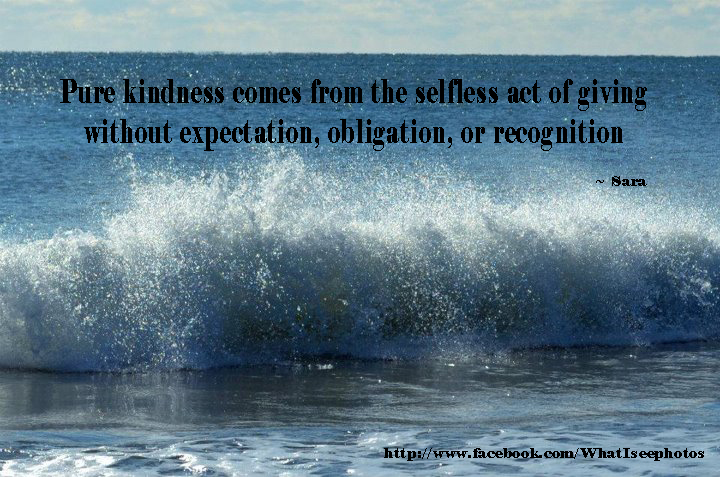 I think then that there are two types of kindness one from our soul and one from the ego. I think that “pure kindness” is something from your soul. It is an act that is done selflessly and is given without any expectation, obligation or recognition. I believe as people we do this time and time again but it is not always seen. Many people donate anonymously, looking for nothing in return. Many people volunteer and help others. We smile, or go out of or way for someone else. Look at all we do for our families, sometimes it’s not out of any obligation or expectation but just pure kindness or love.